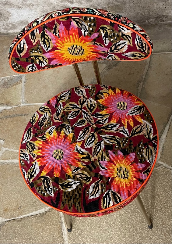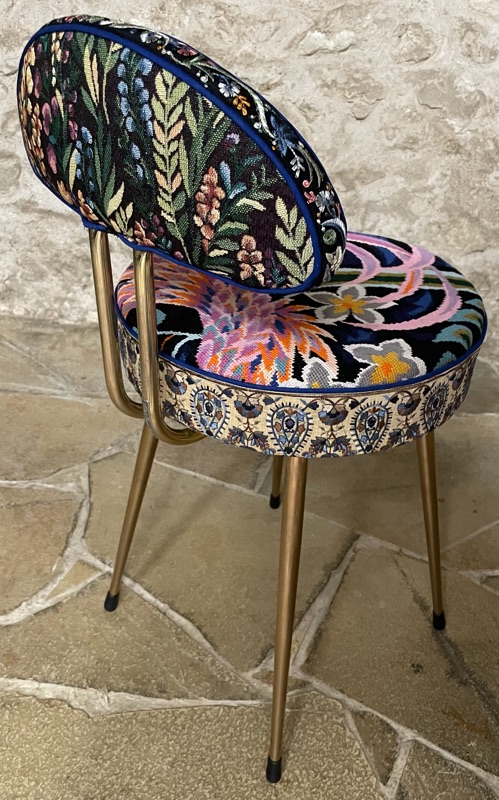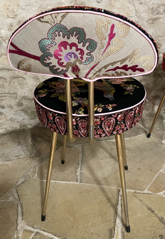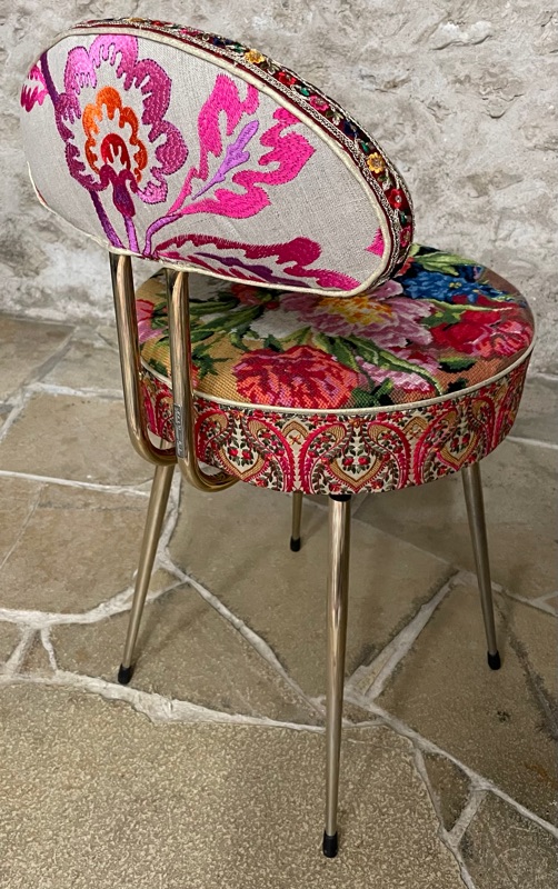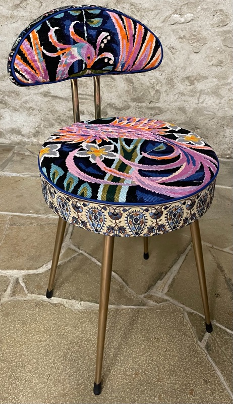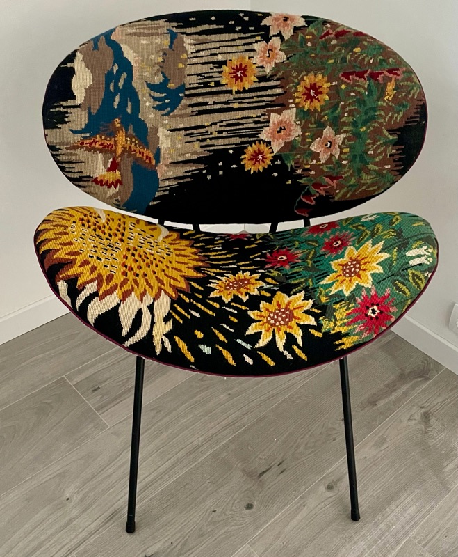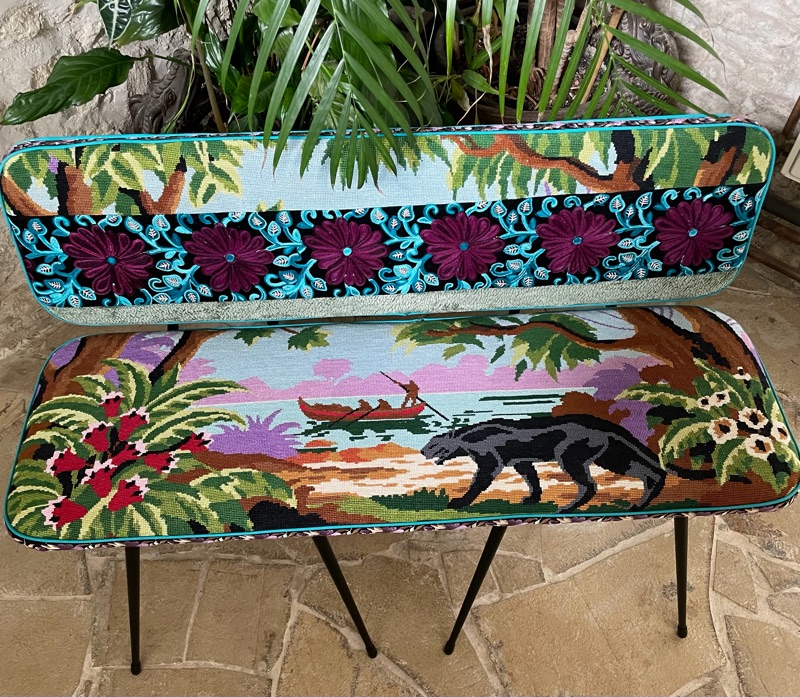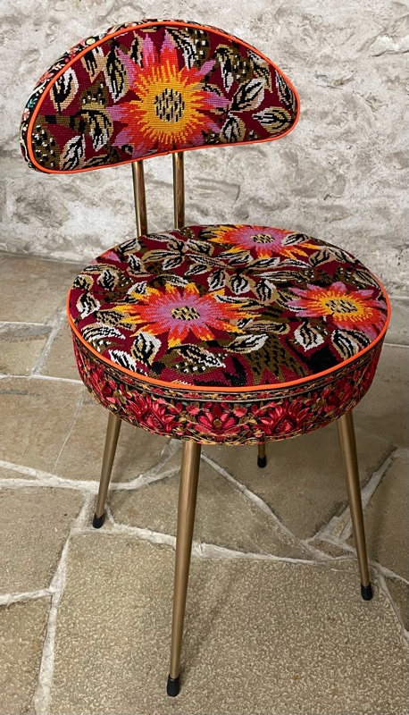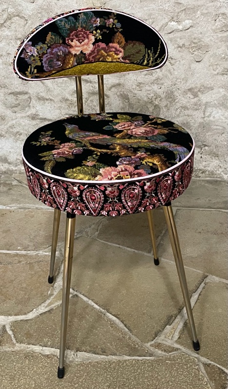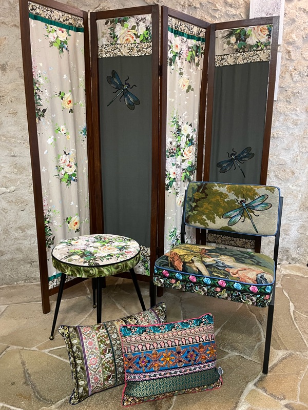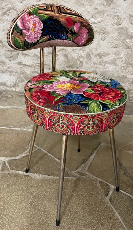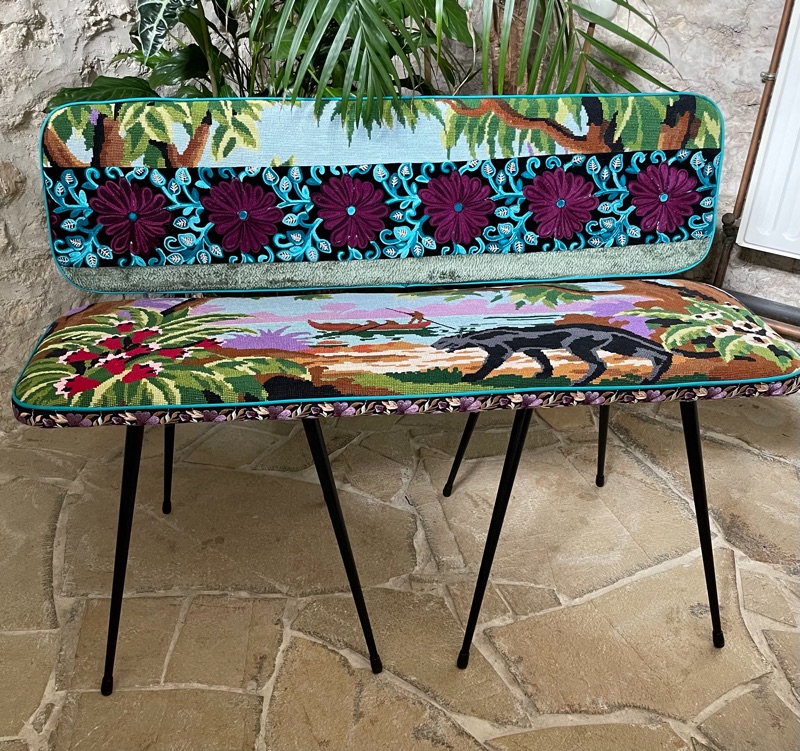 Je chine et je crée ! Tissus , canevas, galons anciens , fauteuils et meubles sont mes sources d'inspiration.