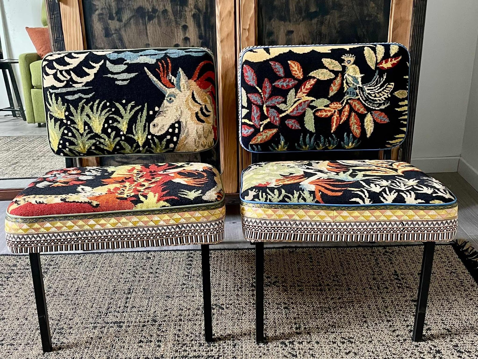 DUO LA LICORNE fauteuils et canevas vintage dos velours et galons brodés VENDUS